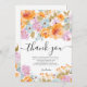 Uttryck din tacksamhet med detta eleganta, handmålade boho-blommiga bröllopsfest-kort med akvarell. Med en livfull blomsterarrangemang i pastellfärger av orange, lila och blå, inramar detta kort vackert det hjärtliga tackmeddelandet. De känsliga blommorna och sofistikerade typografin gör det perfekt för vår- eller sommarbröllopsfester, och tillför en touch av elegans och charm. Idealiskt för att tacka gästerna för deras närvaro och genomtänkta gåvor, fungerar detta kort som en vacker souvenir från din speciella dag.