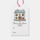 Matchande presentkort för julfirande. Design med en festlig och minimalistisk handritad klotterstil-hem med en krans på en röd ytterdörr och små träd. Fullt redigerbar mall.