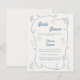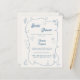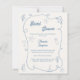 En handritad bröllopsfestinbjudan med strand, kusttema. En mjuk elfenbensvit bakgrund, dammig kustnära blåa element. Personifiera och lägg till hennes namn och detaljerna.