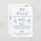 Europeiskt inspirerad blå och vit handritad excentrisk och fantasifullt bröllopsinformationskort. Detta roliga och excentriska bröllopsinformationskort har en lekfull design med en handritad slinga högst upp, omgiven av söta små illustrationer som ett champagneglas, serveringsbestick, bröllopstårta, festlig disko boll, "Just nyss gifta" bil och bröllopsringar. Dessa charmiga detaljer ger en lättsam och elegant touch med en raffinerad europeisk influens.