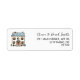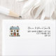 Matcha returetiketter för att skicka julfestinbjudningar. Utformning med ett festligt och minimalistiskt handritat Dodle-stil hus med en krans på en röd ytterdörr och lite träd. Helt redigerbar mall med namn och adress.