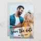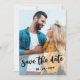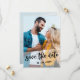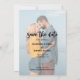 Dubblan sparade datumet med två utfallsbilder från porträtt av lycklig-paret i fullt. Fotot på framsidan har ett genomskinligt överlägg, klippt till en geometrisk vinkel och markerad med "spara datumet" i ett studsskript. Fotot på baksidan har en övertäckning av fullt faux vellum stil för att hålla namn, bröllop-datum och all ytterligare information som du vill lämna i detta skede.