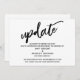 Denna svits utmärkande beror på det moderna, handskrivna typsnittet som används för accentfraser. Om du behöver låta dina gäster veta att ditt bröllop har ställts in, ger detta kort ett djärvt, iögonfallande alternativ. I denna del användes det handskrivna typsnittet för att skapa en enkel grafik som visar ordet "uppdatering". Använd mallfälten för att lägga till dina personliga detaljer och gör denna unika, moderna design till din egen. Den vita bakgrunden kan ändras till valfri färg du föredrar. Vänligen hör av dig med eventuella specialförfrågningar eller för anpassningshjälp. // 100 //