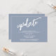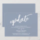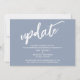 Denna svits utmärkande beror på det moderna, handskrivna typsnittet som används för accentfraser. Om du behöver låta dina gäster veta att ditt bröllop har ställts in, ger detta kort ett djärvt, iögonfallande alternativ. I denna del användes det handskrivna typsnittet för att skapa en enkel grafik som visar ordet "uppdatering". Använd mallfälten för att lägga till dina personliga uppgifter och gör denna unika, moderna design till din egen. Den enfärgade bakgrunden kan ändras till valfri färg du föredrar. Vänligen kontakta oss med eventuella specialförfrågningar eller för anpassningshjälp. // 100 //