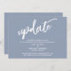 Denna svits utmärkande beror på det moderna, handskrivna typsnittet som används för accentfraser. Om du behöver låta dina gäster veta att ditt bröllop har ställts in, ger detta kort ett djärvt, iögonfallande alternativ. I denna del användes det handskrivna typsnittet för att skapa en enkel grafik som visar ordet "uppdatering". Använd mallfälten för att lägga till dina personliga detaljer och gör denna unika, moderna design till din egen. Den enfärgade bakgrunden kan ändras till valfri färg du föredrar. Vänligen hör av dig med eventuella specialförfrågningar eller för anpassningshjälp. // 100 //