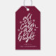 Elegant, moderna märkre för helgdag som innehåller frasen "All is lugn, all is bright" i ett vitt, handskript med stjärndekorerade accents mot en bakgrund för berry lila. Anpassa presentens framsida genom att lägga till ditt namn eller din anpassningsbar märkre. Märkrn med anpassningsbar gåva går tillbaka till mönster av lila svälter snöflingor.