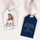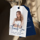 Lägg till en märkre för personlig i studentfestens favoritsäckar och lådor med det här fotot studenten tack för att du ger märkre! Studenten-förmånstaggen innehåller lodrät student med fullt-utfall med "Tack" som visas i ett handskrivet marint skriptöverlägg. Anpassa studenten-favorittaggen för fotot till student namn och studenten. Märkrn återgår till visning av ditt tackmeddelande eller anpassningsbar. Det moderna studenten-tack du vill ha är perfekt för högskoleexamen och högskoleexamen!