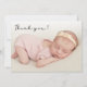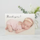 Enkel, modern, handskriven skrift Foto Newborn Baby Tack Birth-annons Card. Har en vacker "tack"-text i ett handskript med bokstäver för övertäckning av teckensnitt. Förskapat personligt meddelande på baksidan i svartvitt. Könsneutral, underbar för flicka eller pojke. Enkel att anpassa med ditt baby-foto och din information.