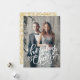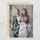 Skicka älskade lite helgdag till vårt Hand-Lettered Helgdag Cheer-fotokort. Det Julhälsningar kortet visningar fotot med frasen "Helgdag Cheer" i ett vitt, handskrivet skriptöverlägg. Anpassa framsidan genom att lägga till foto och namn. Kortet återgår till guld och vita hollbär och löv mönster.