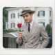 En snyggt man i ett beige kostym och fedora håller ett röd ros medan han står bredvid ett vintage bil med ett lyxhus i bakgrunden