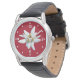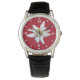 Handsome wristwatch med grafik av en enda Alpine-blomma av en Edelweiss, på en röd bakgrund. Vita prickar och nummer dekorerar utsidan kant i ansikte. Anpassa om du vill lägga till text.