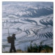 Hani flicka som bär basket med ris terace. kakelplatta