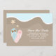 Bröllop spara datum aviserar eller inbjuder till en vacker vektorillustration av sandaler med rosa och blå flip flop på en sandstrand vid havet med ett par stjärnfiskar. Perfekt till stranden, tropiska destinationer eller sommartid bröllop.
