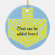 Hanukkah Dreidel/Blue/Gult Circle Ornament. (2 sidor) Anpassa genom att ta bort "Text kan läggas till här" på framsidan och baksidan av dekorationen. Skriv sedan in ditt eget ord i ditt favoritteckensnitt färg, storlekt och stil. Tack för att du stannade och shoppade förbi. Mycket uppskattat! Lycklig Chanukah/Hanukkah! Ge träd mycket mer helgdag med en anpassningsbar keramisk prydnadsprodukt. Lägg till familjefotografier, bilder och personliga meddelanden på båda sidor om denna utsmyckning. En kniv av guld-tråd gör det enkelt att hänga upp denna fantastiska keepsaké. Mått: Diameter: 2,87 tum Tjocklek: 0,156 tum Vikt: 1,4 oz. Utskrift av vit porslin Fullt-färg, utfallande fullt på båda sidor