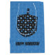 Här har vi en underbar presentväska som innehåller en skuren av en dröm med många Hanukkah-godis i den, på en himlar blå mönster av David stjärna för bakgrunden. Texten på väskan kan tas bort eller anpassas för mottagaren. Den här väskan är en matchning mot andra presentpåsar, som slår pappra, vävnadspapper och ett hälsningskort! Det kommer att göra en perfekt till din gåva till dina vänner och din familj den här julhelgen.