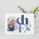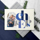 Dessa 7 x 5-tums fotohälsningskort i helgdag har hälsning, "Cheers" i stort blått och grått på en chiffonvit bakgrund. Anpassa med ditt favoritfoto, namn och år.