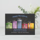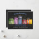 Festlig och färgrik presenter fodras i en ro mot en mörk bakgrund. Känslan "lyckliga Hanukkah" är förtryckt.