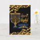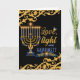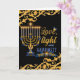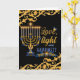 Utformningen av eleganten för en lykt Menorah som är försedd med olivoljefat grenar och ord Kärlek, ljus och lycka. Ett vackert gyllene gräns på mörk blått bakgrund. Inuti står det "Lycklig Hanukkah" med gott om utrymme för dig att skriva ditt engagemang för den person som kommer att få det här vackra kortet.