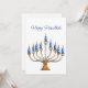 Vattenfärgmenorah med blå och vit brinnande ljus. Lycklig Hanukkah hälsning och känslan på rygg kan ändras. AI-assisterad grafik som köpts med kommersiell använda. Bild: CosmicMeta