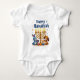 Four furry friends. Nine glowing candles. One menorah lighting up the room like it’s hosting a toddler rave. This festive baby bodysuit stars a bunny, two cats, and a pup—all gathered around the menorah with dreidels in paw and stars in their eyes.