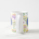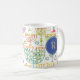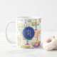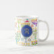 Den här anpassningsbarna har helgdag kaffe mugg en chic mönster av guld, grönt och lila menorah och guld Star av David på vit bakgrund. På vardera sidan finns en blå cirkel som är skuren i guld för att ditt monogram ska kunna anpassas. Drick i stil! Designad av världsberömd konstnär ©Tim Coffey.