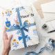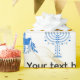 Celebrate the Festival of Lights with this beautifully designed Hanukkah wrapping paper featuring a classic menorah, playful dreidel, peaceful dove and traditional block-print motifs in rich yellow and blue. Perfect for holiday gifting, this design also allows full customisation — customers can replace the main image with their own and add personalised text for a meaningful, one-of-a-kind touch. Ideal for presents, party favours and festive décor.