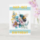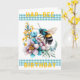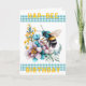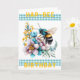 Hap-Bee Birthday Card. Ett vattenfärgstryck av ett bi som håller runt söt blommor. En turkos gingham-remsa både över och under huvudbilden, med ord "Hap-Bee" Birthday" i en mörk gult. Det viktigaste färg är turkos, gult och en muterad lila. Inuti budskapet står det: "önskar dig en underbar dag." Det här meddelandet kan anpassas till skrivan av ditt eget speciella ord.