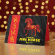 Välkommen det kinesiska nyåret den 17 februari 2026 med detta vykort, som har en fantastisk design med en eldröd häst med en man och svans som liknar flammor, och flammotiv, på en falsk svart satängtyg. Texten och meddelandet kan anpassas både på kinesiska och engelska.