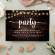 Elegantly announce your happily ever after with our modern rustic brown wood string lights theme wedding elopement, wedding reception dinner and dancing celebration invitation card, "Happily Ever After Party". Tailored for couples continuing their love story, this invitation strikes a perfect balance of sophistication and charm, setting the scene for an unforgettable event. Featuring a modern contemporary script design, it adds a touch of timeless grace to your special day.