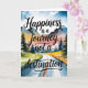 Share the wisdom of the road with this stunning watercolor card. The design features a beautifully painted scene of a winding road leading through majestic mountains and pine forests, bathed in warm sunset colors. The inspirational quote, "Happiness is a journey, not a destination," is elegantly hand-lettered over the landscape. This card is perfect for travel lovers, a retirement gift, a new beginnings message, or general motivational stationery. Use it to encourage friends and family to appreciate the present moment and the process of growth. The artistic landscape painting aesthetic makes it a memorable keepsake.
