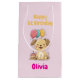 Turning ONE is a special occasion! So wrap that 1st birthday gift in a special way. This cute gift bag for a little girl turning one features a happy puppy, a cake and balloons. Personalize it with the birthday girl's name to make it even more special. The back is full of little puppies joining the party :-) Also check out my matching birthday cards in various sizes. Also available for little boys in blue. Designed by Best Baby Gifts - given with love.