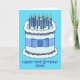A simple illustration of a blue and white birthday cake, decorated with lit candles on top and a blue bow tied around it. The image is set against a turquoise colored background and accompanied by the words 'Happy 70th Birthday Nate'.