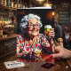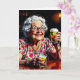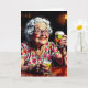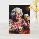 A funny birthday card full of aging humor. A comic cartoon of an elderly woman sitting at a bar with a shot and a beer celebrating her birthday.