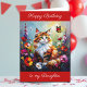 A sweet birthday card that you can personalize. This one says daughter but you can change that. The front has a cute whimsical colorful folk art cat sitting in flowers and surrounded by butterflies.