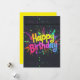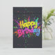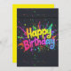 Dynamic zoom in on a vibrant, colorful 'Happy Birthday' text, surrounded by an explosion of paint splashes in vivid hues. The camera sweeps in with a lively, playful motion, emphasizing the joyful energy of the scene. Bright, contrasting colors pop against a dark background, creating a festive atmosphere. The lighting is bright and cheerful, enhancing the celebratory mood. The composition is bold and eye-catching, perfect for a birthday celebration.