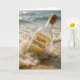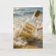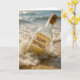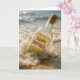 A clear glass wine bottle with a birthday message sits partially submerged in ocean waves on a sunny beach.