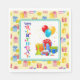 A Paper Napkin That's In A Colorful Yellow Design With Presents, Balloons And A Slice Of Cake For A Happy Birthday Party