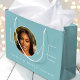 Send love and best wishes on their birthday with a custom photo gift bag! This chic design features a favorite photo integrated into the word "LOVE", complemented by trendy, modern typography and a minimalist aesthetic. You can easily personalize the template with the recipient's name and age, making it ideal for milestone birthdays including 18th, 21st, 30th, 40th, 50th and 60th. This elegant design is also perfect for Valentine's Day, a bridal shower, bachelorette party, holidays, or a special occasion. It adds a unique and thoughtful touch to your gift wrap, and is a lovely choice for a daughter, girlfriend, wife or best friend. Available in either a matte or glossy finish. Printed colors: soft muted teal blue and white — or customize the background color with the design tool.