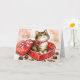 Charming watercolor of a tabby cat in a heart-shaped box of Valentine's chocolates, surrounded by scattered candy, looking up at a man.