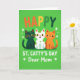 This card shows three cartoon cats lined up shoulder to shoulder on a soft green gradient background that feels like early spring. A dark green cat stands on the left, a white cat with lime-green spots leans in at the center as if cozying up to the others, and an orange cat on the right tilts its smile toward the group, giving the scene a friendly, affectionate closeness 💚. Across the top, the word “HAPPY” sits in large letters that shift from orange to yellow to deep green. The cats’ wide eyes and small smiles look outward, like they’re sharing a sweet inside joke with the viewer. Below them, “ST. CATTY’S DAY * Dear Mom *” appears in white text centered near the bottom edge, with the star separators adding a little sparkle. Tiny white shamrocks float around the cats like confetti, reinforcing the St. Patrick’s Day theme ☘️. The overall layout is simple and graphic, with flat color areas and crisp outlines against the green backdrop. White shamrock shapes are scattered across the background, some near the top corners and others drifting beside the cats.