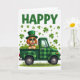 This card shows “HAPPY” in large green letters across the top, setting a St. Patrick’s Day scene right away. Below, a cheerful cartoon dog stands in the back of a classic pickup truck, and its open-mouthed grin and bright eyes feel like it’s sharing a friendly wink with the viewer 💚. The dog wears a green leprechaun hat with a gold buckle and dark sunglasses, adding a cool, easygoing look. Its warm russet fur contrasts nicely against the many shades of green around it, including a shiny green collar at its neck. The vintage pickup is covered in a green plaid pattern, and the truck bed is packed with shamrocks and tufts of green grass, like it’s carrying a lucky haul for someone special ☘️. More shamrocks float across the white background in different sizes and angles, like confetti drifting through the air. Along the bottom edge, a soft sweep of green grass grounds the scene, with scattered clovers hovering above the truck on the bright white backdrop.