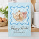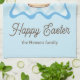 Celebrate Easter with this adorable design featuring a charming brown bunny nestled inside a beautifully decorated teapot, adorned with delicate flowers and a sweet pink bow. A tiny Easter egg adds to the festive spirit. The whimsical illustration is framed by a lovely light blue gingham pattern and a scalloped border, with "Happy Easter" scripted gracefully below. This delightful design is perfect for spring gatherings, Easter egg hunts, or simply spreading joy. Add your family name.