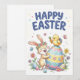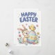 Happy Easter illustration featuring a joyful bunny hugging a colorful Easter egg while a cheerful chick perches on top holding a carrot. Surrounded by spring flowers, pastel eggs, and fluttering butterflies, this design captures the playful and heartwarming spirit of Easter.