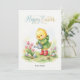 Sweet Easter illustration featuring a cute baby chick wearing a green raincoat and red boots while watering spring tulips in a garden. Colorful Easter eggs, butterflies, and tiny snails create a cheerful spring scene full of warmth and joy.