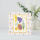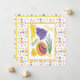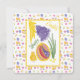 Original illustration in oil pastel of a large colorful decorated Easter egg with a little chicken, sunshine and grape hyacinth. With customizable text saying Happy Easter and Easter floral pattern frame. On the back side is blank space for text with Easter pattern frame and small daffodil Easter illustration in the corner.