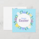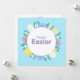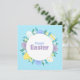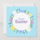 Happy Easter holiday greeting card with a frame of flowers and eggs on blue background