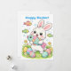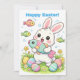 An original kawaii-style Easter card combining two April holidays in one unique design. Features an adorable white bunny happily holding a colorful fish, surrounded by decorated Easter eggs, spring flowers, and playful fish floating in the air. The front reads "Happy Easter — Something's Fishy this Easter" capturing both the Easter spirit and the April Fool's Day humor perfectly. Bright pastel colors on a clean white background.