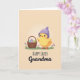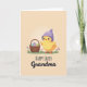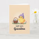 This card shows a cute, round yellow chick with rosy cheeks and big dark eyes, looking outward with a gentle, friendly gaze 🐰. A soft lavender cone-shaped hat with a tiny pom-pom sits on its head, and its little wings open as if offering a small welcome. Beside the chick, a woven brown basket rests close enough to suggest a shared moment, filled with decorated eggs in pastel blue, pink, purple, and green. Each egg has its own simple pattern, adding variety while keeping the scene calm and sweet. Along the bottom, a narrow strip of green ground is dotted with tiny white specks and small spring flowers in purple, pink, and white 🌷. The background is a creamy beige, giving the illustration a warm, gentle glow that keeps the focus on the chick and basket. The words “Happy Easter Grandma” appear as a neat greeting across the upper area in a darker contrasting color. The chick stands to the left of the basket, with the pastel eggs clustered on the right against the soft beige backdrop.
