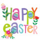 This cheerful “Happy Easter” design pops with bright spring colors and playful charm. Each letter is uniquely colored in lively shades of pink, green, purple, orange, and blue, creating a joyful, eye‑catching rhythm. Some letters transform into decorated Easter eggs, complete with soft pastel stripes that add a sweet seasonal touch. Small flowers and leafy accents peek around the text, giving the whole piece a fresh, garden‑in‑bloom feeling.