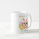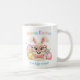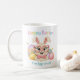 Happy Easter I'm Egg-cited Bunny Coffee Mug. Celebrate Easter with this adorable design featuring a cute bunny in pink heart glasses and a bow tie, surrounded by colorful decorated eggs and tiny butterflies. The playful phrase "Happy Easter I'm Egg-cited!" adds a touch of humor, making it perfect for spreading joy.
